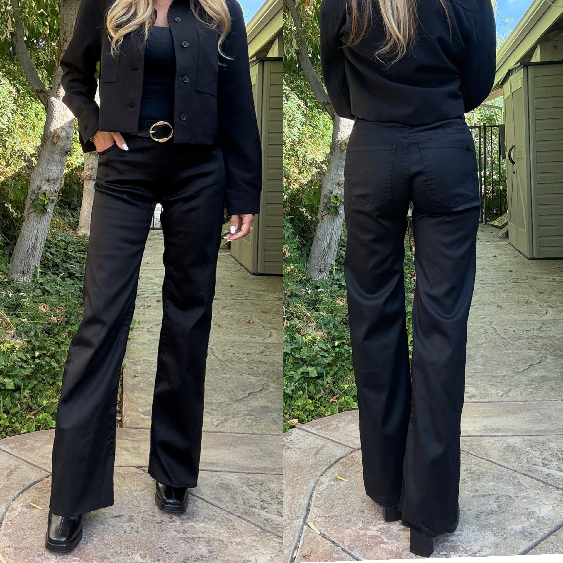 Amanda Black with elastic waist, belt loop, flare, and soft fabric. 98% cotton 2% lycra. Machine washable. Does not wrinkle or fade. Comfortable, stylish, very flattering. Wear with sneakers, sandals, booties, or heels. Wear it casual or dressy for evening. Try them and you will see why these pants have been the #1 selling item in boutiques all around the U.S. Inseam: 30, Rise: 9