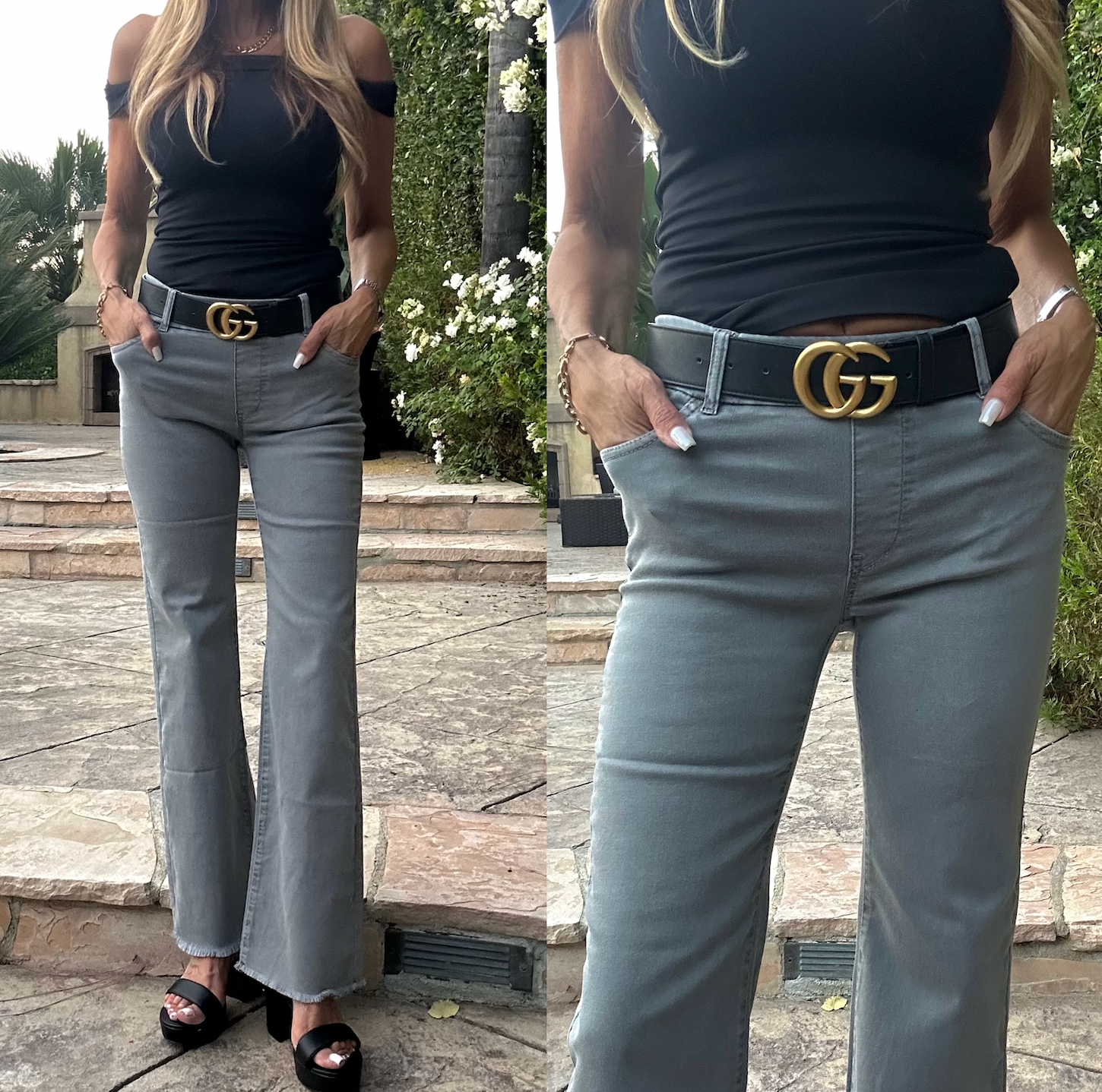 Amanda Dark Gray with belt loop and flare, soft fabric. 98% cotton 2% lycra. Machine washable. Does not Wrinkle or Fade. Comfortable, stylish, very flattering. Wear with sneakers, sandals, booties, heels. Wear it casual or dressy for evening. Try them and you will see why these pants have been the #1 selling item in boutiques all around the U.S. Inseam: 28", Rise: 10"