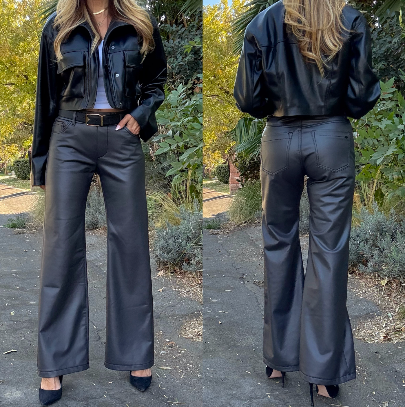 Amanda Dark Gray Vegan with belt loop and flare, soft fabric. 98% cotton 2% lycra. Machine washable. Does not Wrinkle or Fade. Comfortable, stylish, very flattering. Wear with sneakers, sandals, booties, heels. Wear it casual or dressy for evening. Try them and you will see why these pants have been the #1 selling item in boutiques all around the U.S. Inseam: 28", Rise: 10"