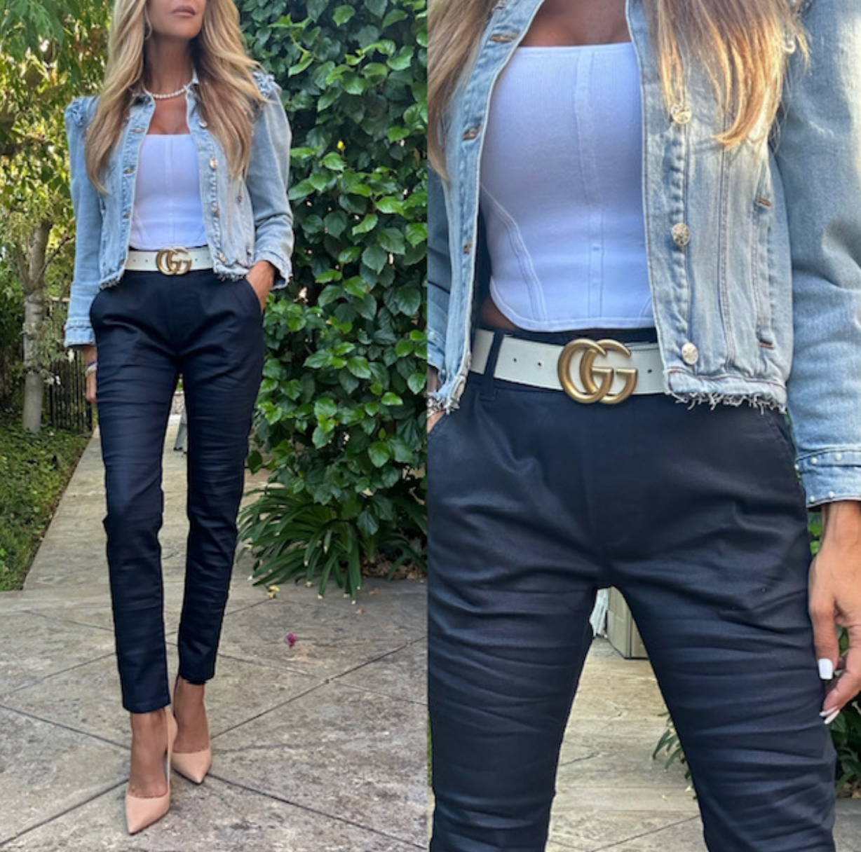 Style Dafna With Belt Loop. Blue Line Print. 98% cotton 2% Lycra. Machine washable. Does not Wrinkle or Fade. Comfortable, Stylish, Very Flattering. Wear with or Without Belt. Wear with Sneakers, Sandals, Booties, Heels. Wear it Casual or Dressy for Evening. Try them and you will see why these pants have been the #1 selling item in boutiques all around the U.S. Inseam: 27.5", Rise: 10.5".