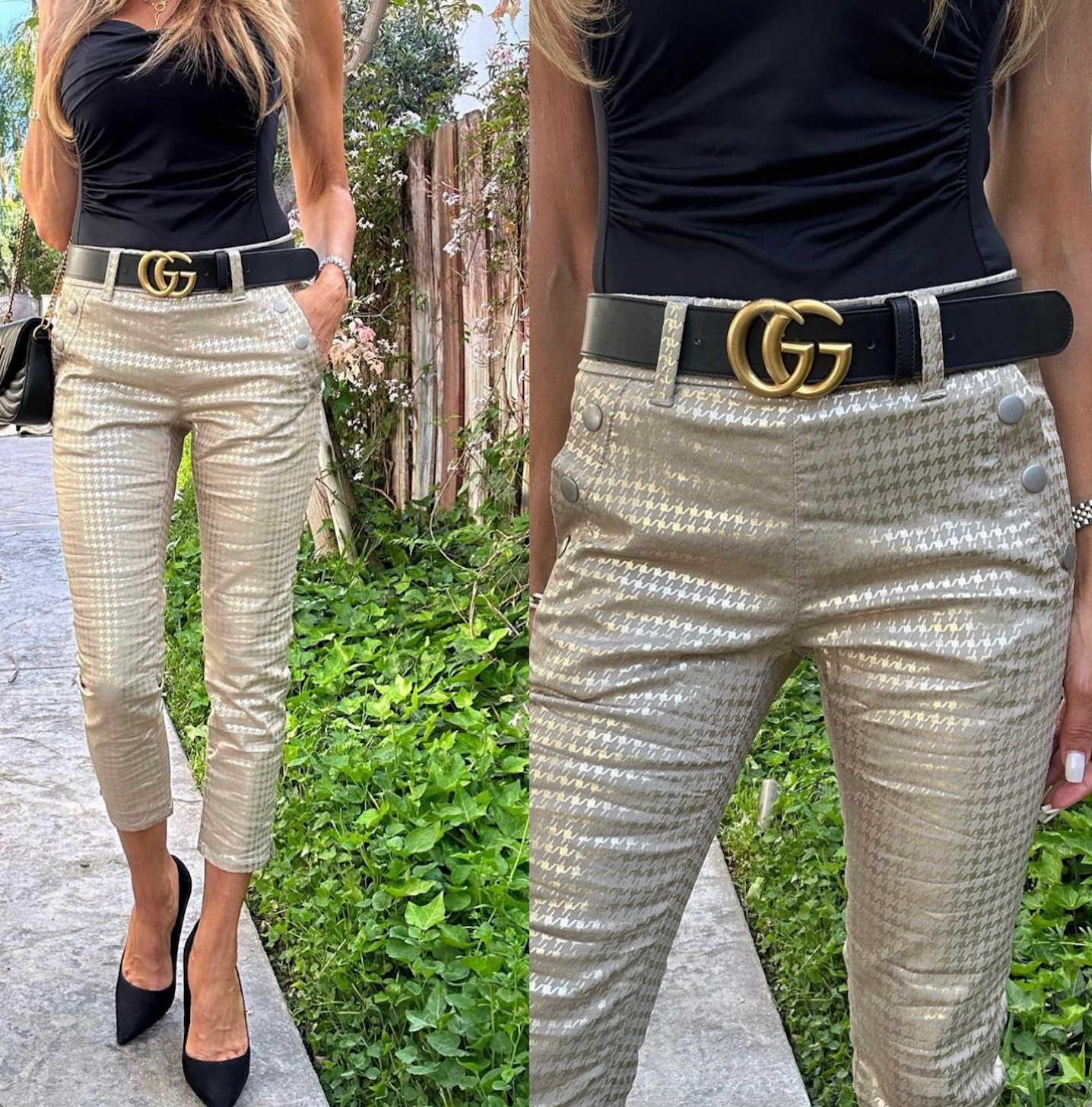 Dafna style Capri with belt loops. Gold Checkered Print. 98% cotton 2% Lycra. Machine washable. Does not Wrinkle or Fade. Comfortable, Stylish, Very Flattering. Wear with Sneakers, Sandals, Booties, Heels. Wear it Casual or Dressy for Evening. Try them and you will see why these pants have been the #1 selling item in boutiques all around the U.S.
