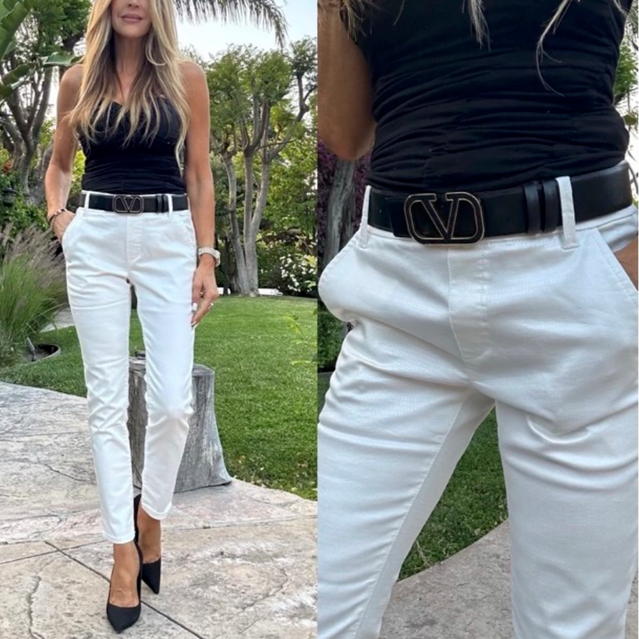 Dafna style with belt loops. White Pearl Snake Print. 98% cotton 2% Lycra. Machine washable. Does not Wrinkle or Fade. Comfortable, Stylish, Very Flattering. Wear with Sneakers, Sandals, Booties, Heels. Wear it Casual or Dressy for Evening. Try them and you will see why these pants have been the #1 selling item in boutiques all around the U.S. Inseam: 27.5", Rise: 10.5".