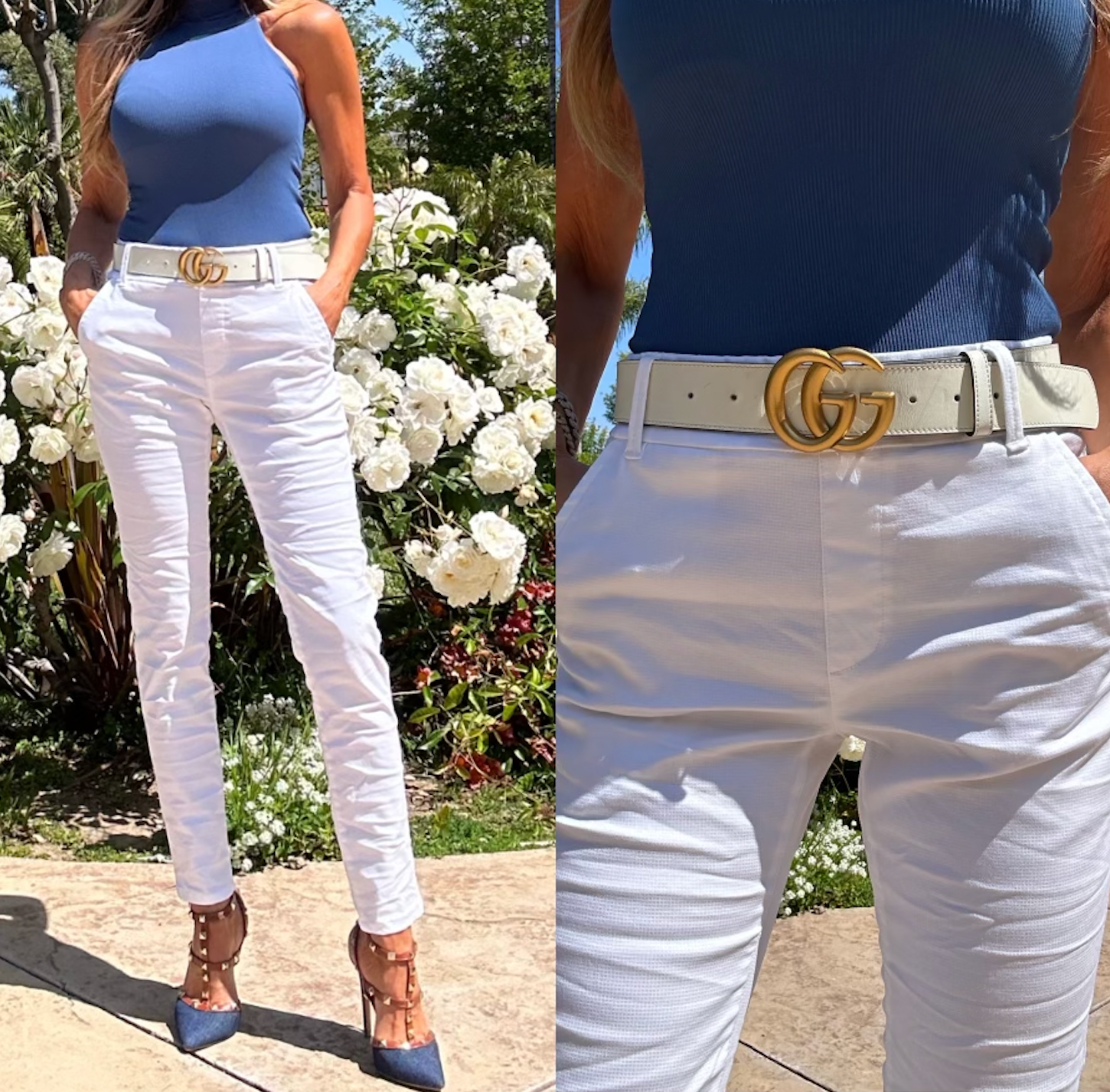 Style Dafna With Belt Loop. White Check. 98% cotton 2% Lycra. Machine washable. Does not Wrinkle or Fade. Comfortable, Stylish, Very Flattering. Wear with or Without Belt. Wear with Sneakers, Sandals, Booties, Heels. Wear it Casual or Dressy for Evening. Try them and you will see why these pants have been the #1 selling item in boutiques all around the U.S. Inseam: 27.5", Rise: 10.5".
