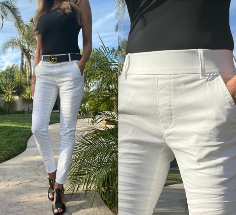 Dafna style with belt loops. White Original Print. 98% cotton 2% Lycra. Machine washable. Does not Wrinkle or Fade. Comfortable, Stylish, Very Flattering. Wear with Sneakers, Sandals, Booties, Heels. Wear it Casual or Dressy for Evening. Try them and you will see why these pants have been the #1 selling item in boutiques all around the U.S. Inseam: 27.5", Rise: 10.5".