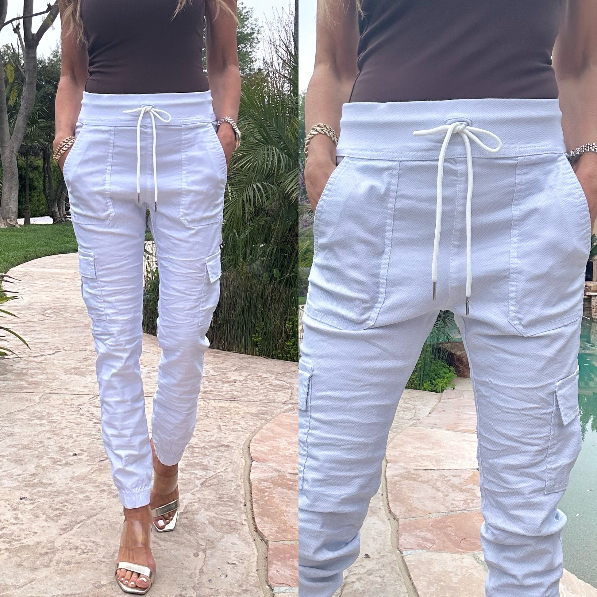 Gaya Cargo Style with a Tie. Cloud Herringbone. 98% cotton 2% Lycra. Machine washable. Does not Wrinkle or Fade. Comfortable, Stylish, Very Flattering. Wear with Sneakers, Sandals, Booties, Heels. Wear it Casual or Dressy for Evening. Try them and you will see why these pants have been the #1 selling item in boutiques all around the U.S. Inseam: 27", Rise: 11".