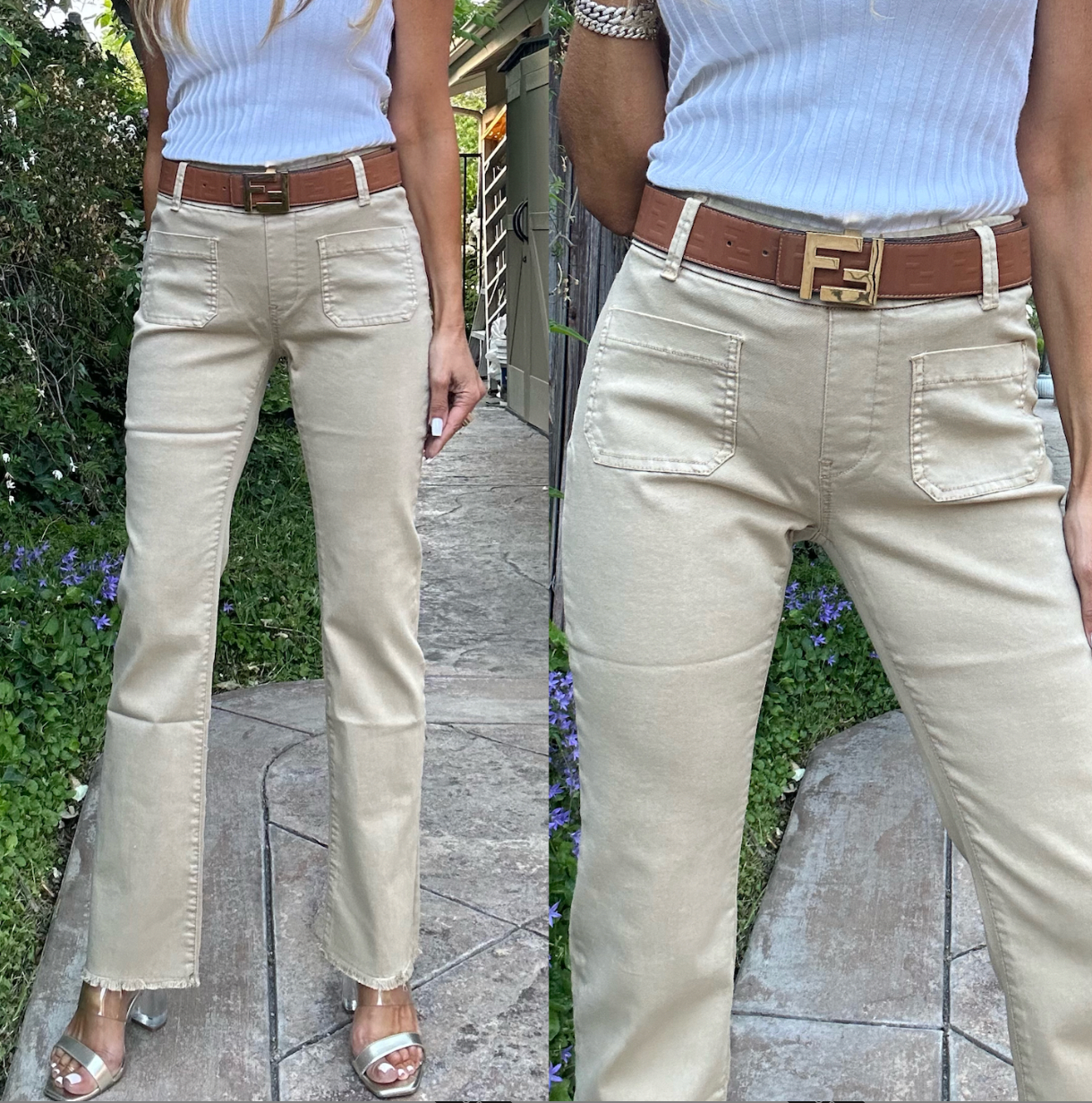 Jerome Beige with belt loops and a slight flare at the ankle, soft Fabric. 98% cotton 2% Lycra. Machine washable. Does not Wrinkle or Fade. Comfortable, Stylish, Very Flattering. Wear with Sneakers, Sandals, Booties, Heels. Wear it Casual or Dressy for Evening. Try them and you will see why these pants have been the #1 selling item in boutiques all around the U.S. Inseam: 29", Rise: 10.5".