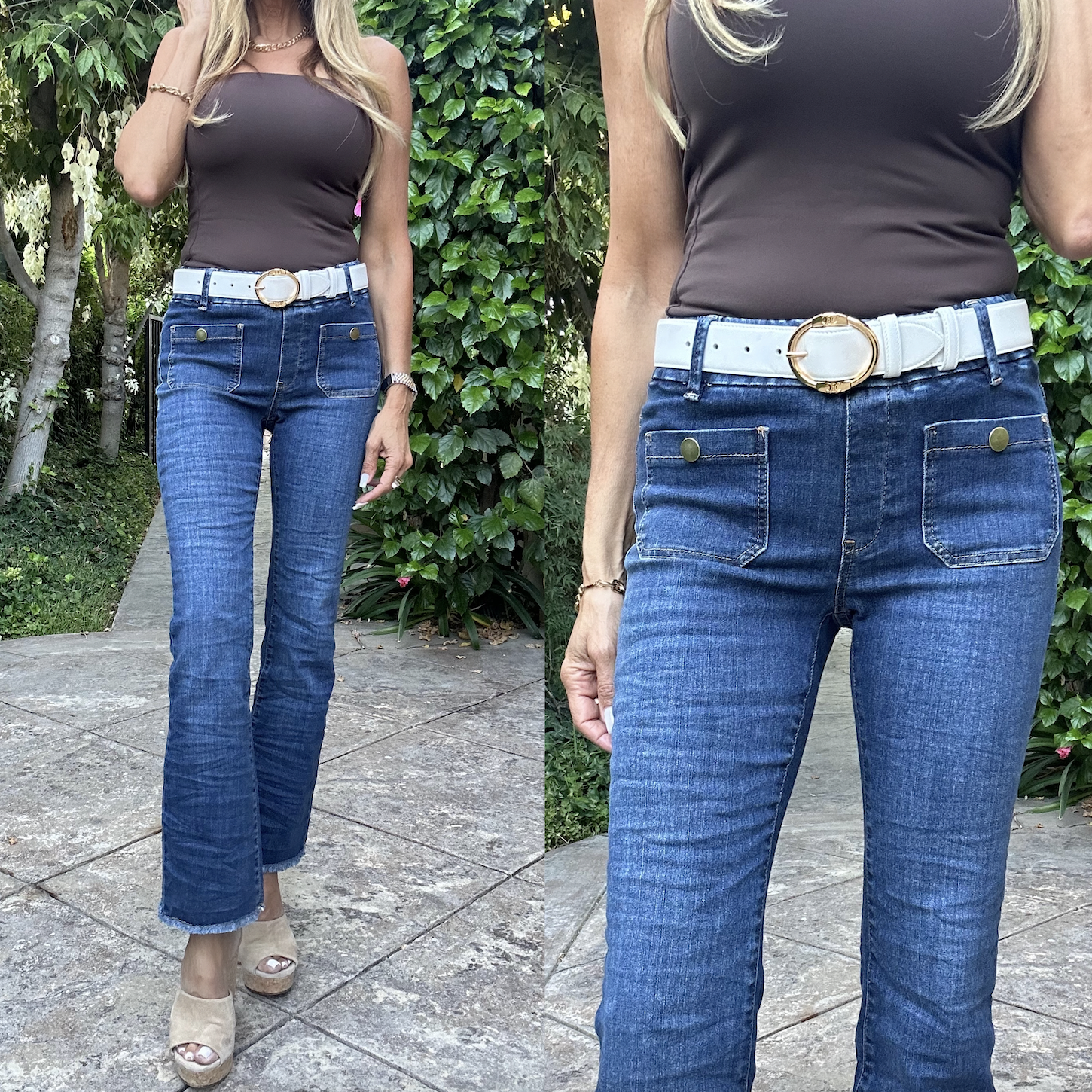 Jerome Button Denim has belt loops and a slight flare at the ankle. 98% cotton 2% Lycra. Machine washable. Does not Wrinkle or Fade. Comfortable, Stylish, Very Flattering. Wear with Sneakers, Sandals, Booties, Heels. Wear it Casual or Dressy for Evening. Try them and you will see why these pants have been the #1 selling item in boutiques all around the U.S. Inseam: 29", Rise: 10.5".