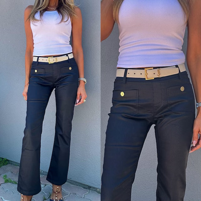 Jerome Button Navy Stripe has belt loops and a slight flare at the ankle, soft Fabric. 98% cotton 2% Lycra. Machine washable. Does not Wrinkle or Fade. Comfortable, Stylish, Very Flattering. Wear with Sneakers, Sandals, Booties, Heels. Wear it Casual or Dressy for Evening. Try them and you will see why these pants have been the #1 selling item in boutiques all around the U.S. Inseam: 29", Rise: 10.5".