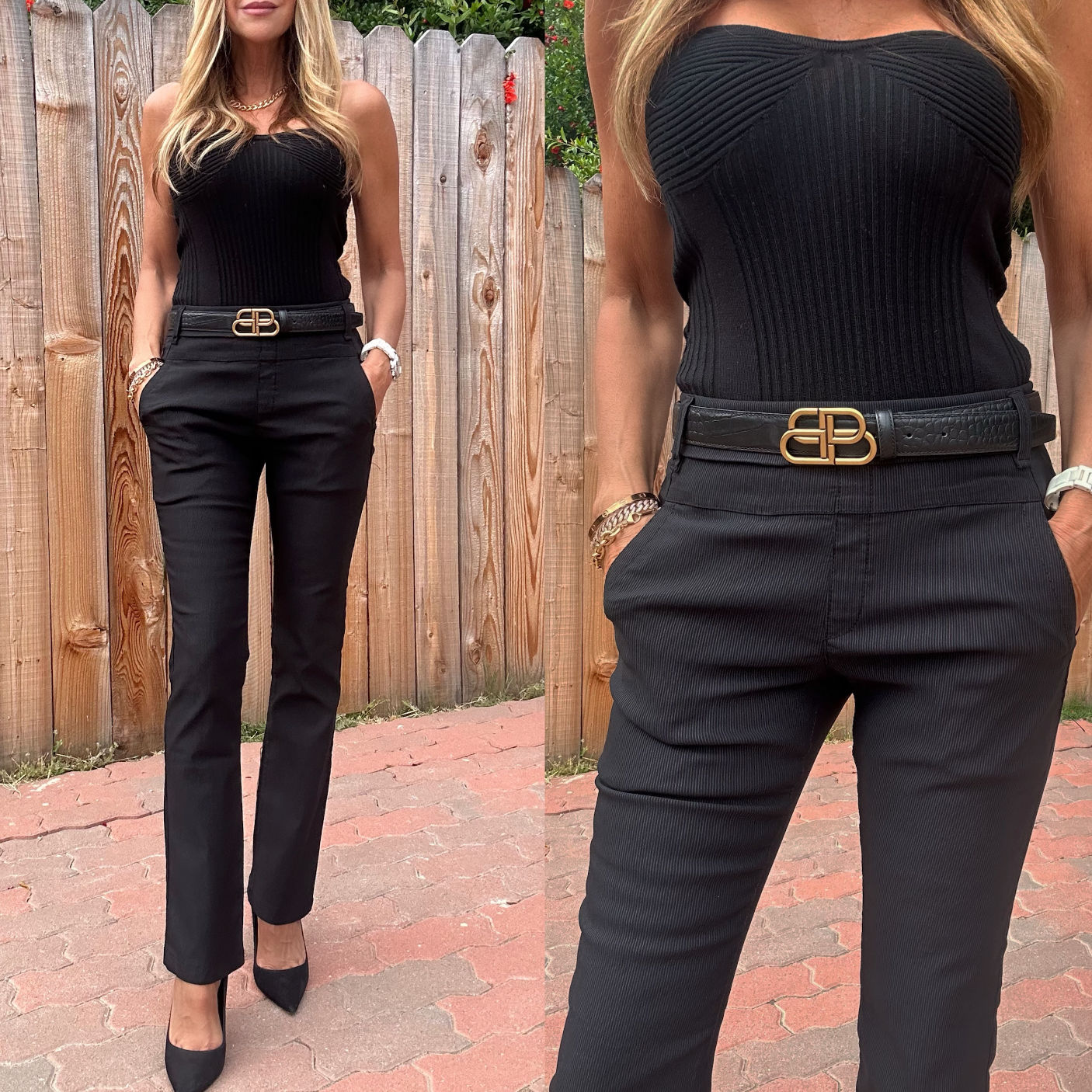 Liat Style Flare with Belt Loops. Black Stripe Print. 98% cotton 2% Lycra. Machine washable. Does not Wrinkle or Fade. Comfortable, Stylish, Very Flattering. Wear with or Without Belt. Wear with Sneakers, Sandals, Booties, Heels. Wear it Casual or Dressy for Evening. Try them and you will see why these pants have been the #1 selling item in boutiques all around the U.S. Inseam: 29.5", Rise: 10".