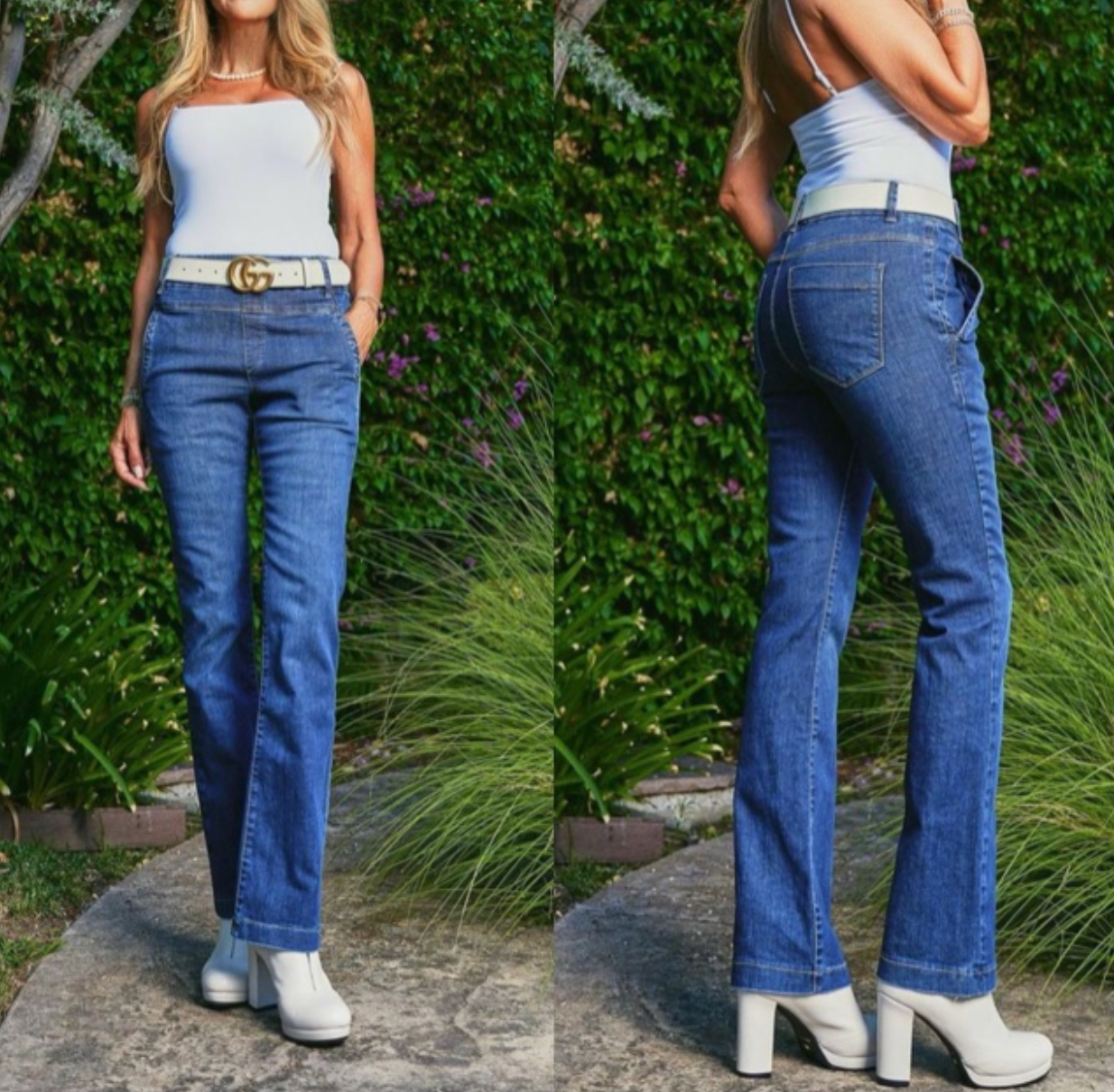 Liat Style Flare with Belt Loops. Denim. 98% cotton 2% Lycra. Machine washable. Does not Wrinkle or Fade. Comfortable, Stylish, Very Flattering. Wear with or Without Belt. Wear with Sneakers, Sandals, Booties, Heels. Wear it Casual or Dressy for Evening. Try them and you will see why these pants have been the #1 selling item in boutiques all around the U.S. Inseam: 29.5", Rise: 10".