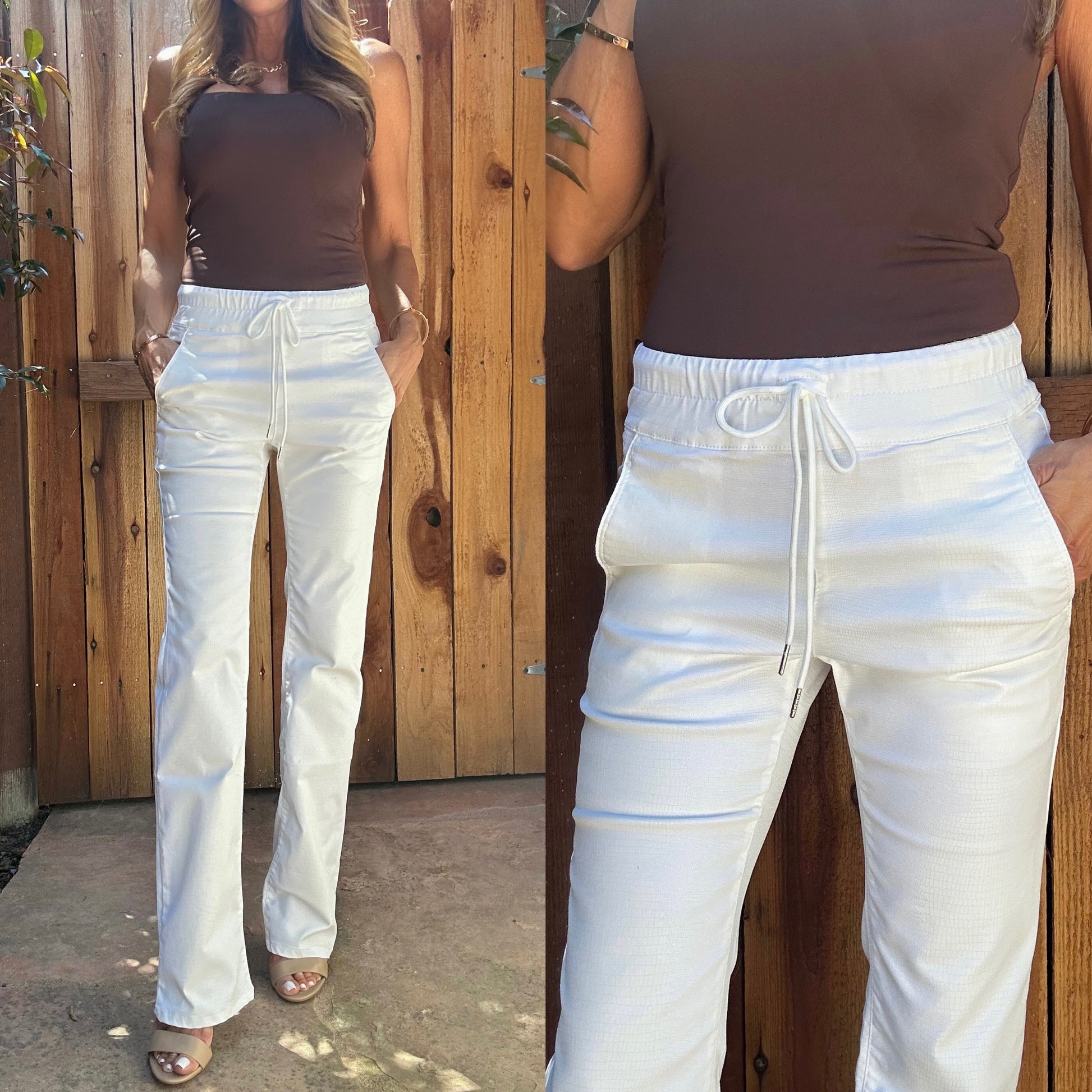 Loren Style with a tie. White Snake print with a wide leg. 98% cotton 2% lycra. Machine washable. Does not wrinkle or fade. Comfortable, stylish, and very flattering. Wear with sneakers, sandals, booties, or heels. Wear it casual or dressy for evening. Try them and you will see why these pants have been the #1 selling item in boutiques all around the U.S. Inseam: 30.5", Rise: 10.5".
