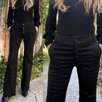 Malan black denim flared style with functional buttons . 98% cotton 2% Lycra. Machine washable. Does not Wrinkle or Fade. Comfortable, Stylish, Very Flattering. Wear with Sneakers, Sandals, Booties, Heels. Wear it Casual or Dressy for Evening. Try them and you will see why these pants have been the #1 selling item in boutiques all around the U.S.