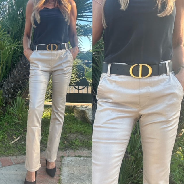 Style Nansi With Belt Loop. Beige/Gold Check pattern . 98% cotton 2% Lycra. Machine washable. Does not Wrinkle or Fade. Comfortable, Stylish, Very Flattering. Wear with or Without Belt. Wear with Sneakers, Sandals, Booties, Heels. Wear it Casual or Dressy for Evening. Try them and you will see why these pants have been the #1 selling item in boutiques all around the U.S. Inseam: 30.5", Rise: 10".