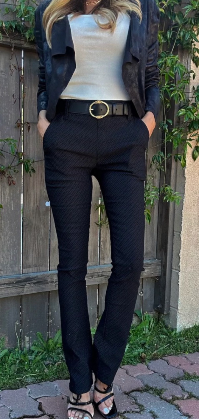 Style Flare with Belt Loops. Black with Pebble Print. 98% cotton 2% Lycra. Machine washable. Does not Wrinkle or Fade. Comfortable, Stylish, Very Flattering. Wear with or Without Belt. Wear with Sneakers, Sandals, Booties, Heels. Wear it Casual or Dressy for Evening. Try them and you will see why these pants have been the #1 selling item in boutiques all around the U.S. Inseam: 30.5", Rise: 10".