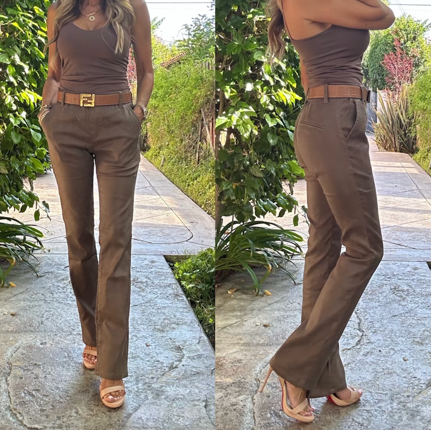 Style Nansi With Belt Loop. Suede Brown Vegan Croc. 98% cotton 2% Lycra. Machine washable. Does not Wrinkle or Fade. Comfortable, Stylish, Very Flattering. Wear with or Without Belt. Wear with Sneakers, Sandals, Booties, Heels. Wear it Casual or Dressy for Evening. Try them and you will see why these pants have been the #1 selling item in boutiques all around the U.S. Inseam: 30.5", Rise: 10".