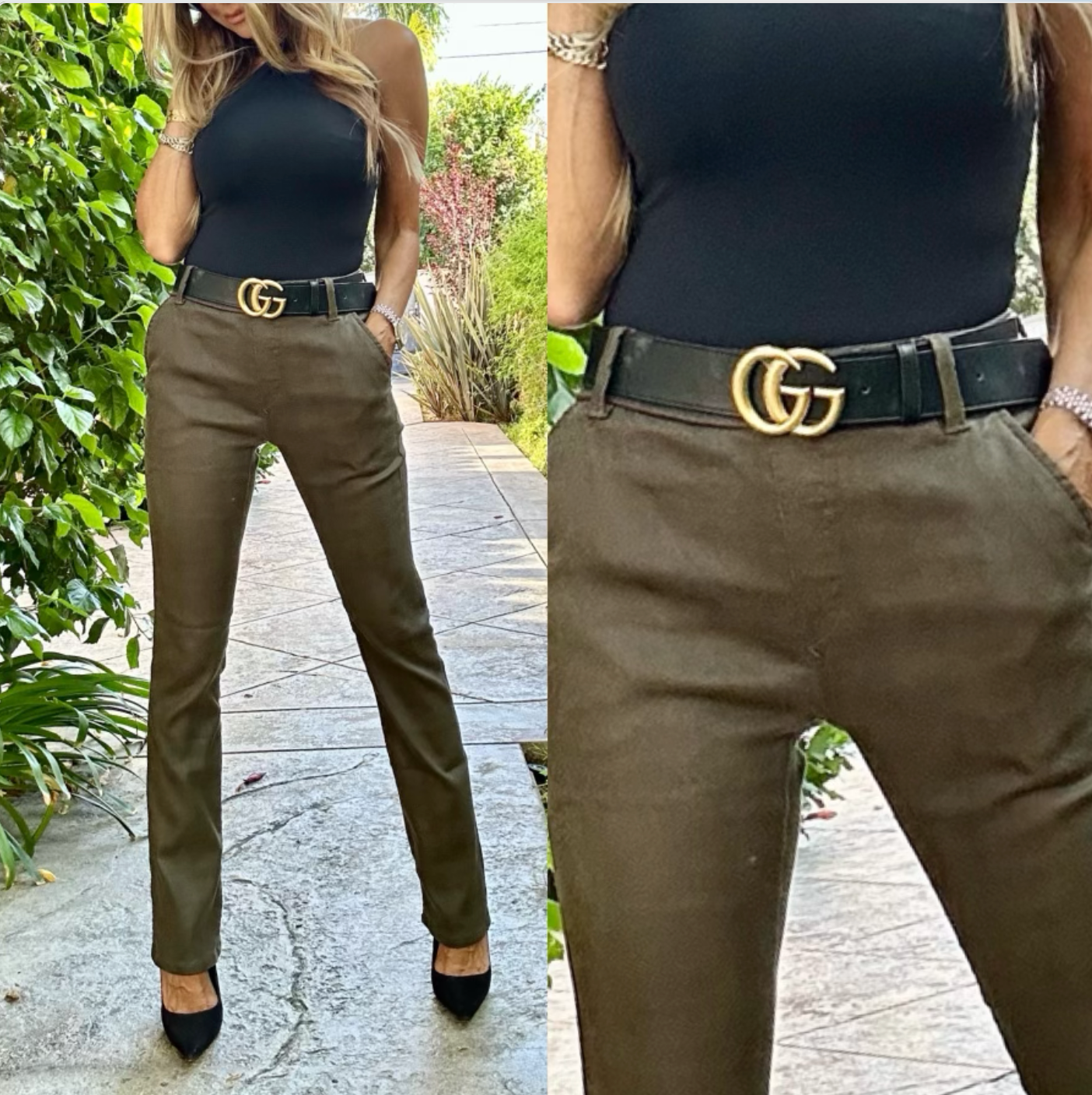 Style Nansi With Belt Loop. Suede Green Vegan. 98% cotton 2% Lycra. Machine washable. Does not Wrinkle or Fade. Comfortable, Stylish, Very Flattering. Wear with or Without Belt. Wear with Sneakers, Sandals, Booties, Heels. Wear it Casual or Dressy for Evening. Try them and you will see why these pants have been the #1 selling item in boutiques all around the U.S. Inseam: 30.5", Rise: 10 1/2".