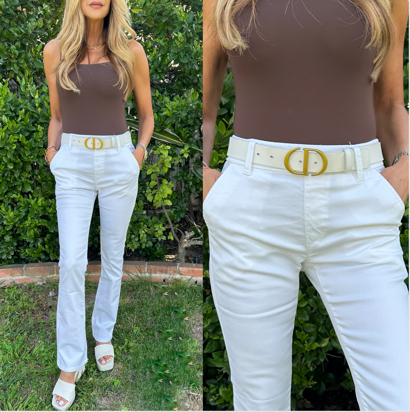 Style Nansi With Belt Loop, White Check pattern . 98% cotton 2% Lycra. Machine washable. Does not Wrinkle or Fade. Comfortable, Stylish, Very Flattering. Wear with or Without Belt. Wear with Sneakers, Sandals, Booties, Heels. Wear it Casual or Dressy for Evening. Try them and you will see why these pants have been the #1 selling item in boutiques all around the U.S. Inseam: 30.5", Rise: 10".
