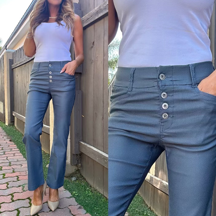 Nora blue speck with flared style and functional buttons. 98% cotton 2% Lycra. Machine washable. Does not wrinkle or fade. Comfortable, stylish, and very flattering. Wear with sneakers, sandals, booties, or heels. Wear it casual or dressy for evening. Try them and you will see why these pants have been the #1 selling item in boutiques all around the U.S. Inseam: 28.5", Rise: 10".