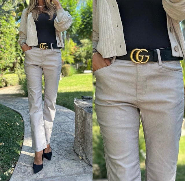 Style Novel With elastic waist, functional button and zipper. Flared Bottom Biege Original Print. 98% cotton 2% Lycra. Machine washable. Does not Wrinkle or Fade. Comfortable, Stylish, Very Flattering. Wear with or Without Belt. Wear with Sneakers, Sandals, Booties, Heels. Wear it Casual or Dressy for Evening. Try them and you will see why these pants have been the #1 selling item in boutiques all around the U.S. Inseam: 27.5", Rise: 11".