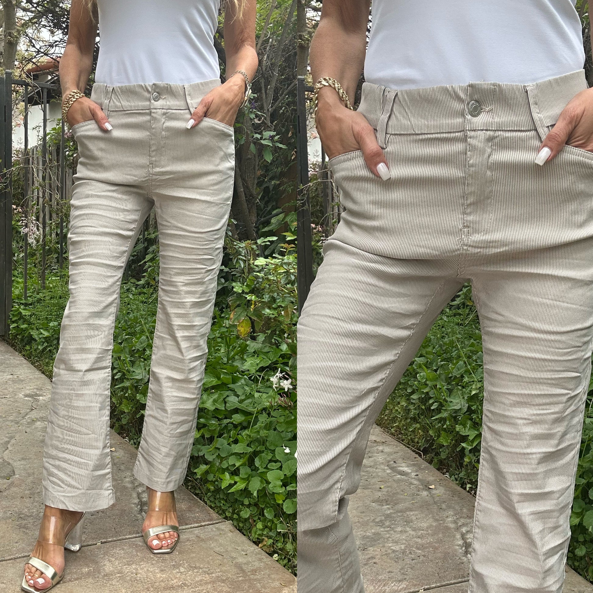 Style Novel With elastic waist, functional button and zipper. Flared Bottom Beige Stripe Print. 98% cotton 2% Lycra. Machine washable. Does not Wrinkle or Fade. Comfortable, Stylish, Very Flattering. Wear with or Without Belt. Wear with Sneakers, Sandals, Booties, Heels. Wear it Casual or Dressy for Evening. Try them and you will see why these pants have been the #1 selling item in boutiques all around the U.S. Inseam: 27.5", Rise: 11".