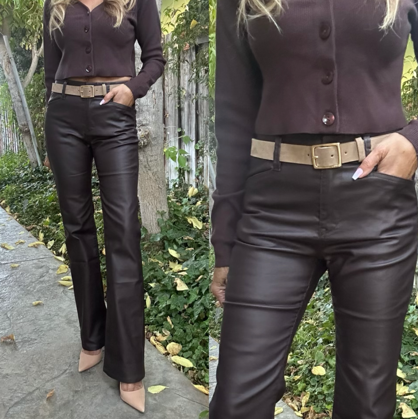 Style Novel With elastic waist, functional button and zipper. Flared Bottom Brown Vegan. 98% cotton 2% Lycra. Machine washable. Does not Wrinkle or Fade. Comfortable, Stylish, Very Flattering. Wear with or Without Belt. Wear with Sneakers, Sandals, Booties, Heels. Wear it Casual or Dressy for Evening. Try them and you will see why these pants have been the #1 selling item in boutiques all around the U.S. Inseam: 27.5", Rise: 11