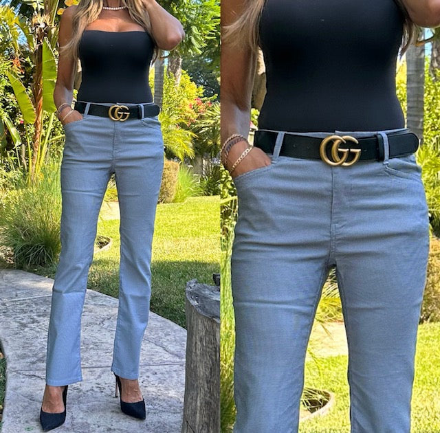 Style Novel With elastic waist, functional button and zipper. Flared Bottom Light Blue Print. 98% cotton 2% Lycra. Machine washable. Does not Wrinkle or Fade. Comfortable, Stylish, Very Flattering. Wear with or Without Belt. Wear with Sneakers, Sandals, Booties, Heels. Wear it Casual or Dressy for Evening. Try them and you will see why these pants have been the #1 selling item in boutiques all around the U.S. Inseam: 27.5", Rise: 11".