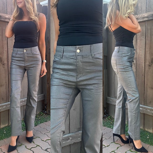 Style Novel Gray with elastic waist, functional button and zipper. Flared bottom gray print. 98% cotton 2% lycra. Machine washable. Does not wrinkle or fade. Comfortable, stylish, very flattering. Wear with or without belt. Wear with sneakers, sandals, booties, heels. Wear it casual or dressy for evening. Try them and you will see why these pants have been the #1 selling item in boutiques all around the U.S. Inseam: 27.5", Rise: 11".