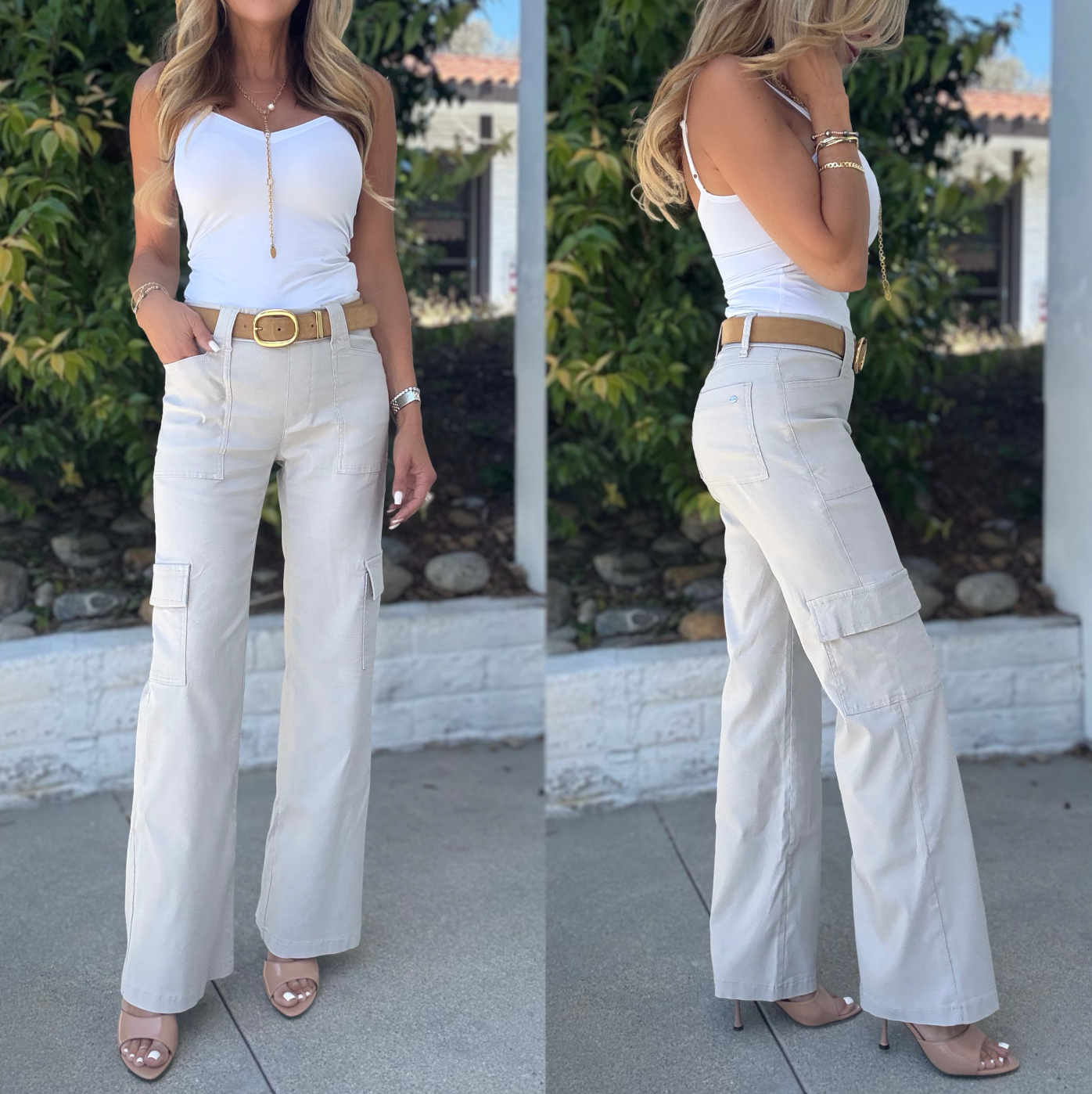 Randi Beige with belt loops and flare at the ankle, soft fabric. 98% cotton 2% Lycra. Machine washable. Does not wrinkle or fade. Comfortable, stylish, very flattering. Wear them with sneakers, sandals, booties, or heels. Wear it casual or dressy for evening. Try them and you will see why these pants have been the #1 selling item in boutiques all around the U.S. Inseam: 31", Rise: 10".