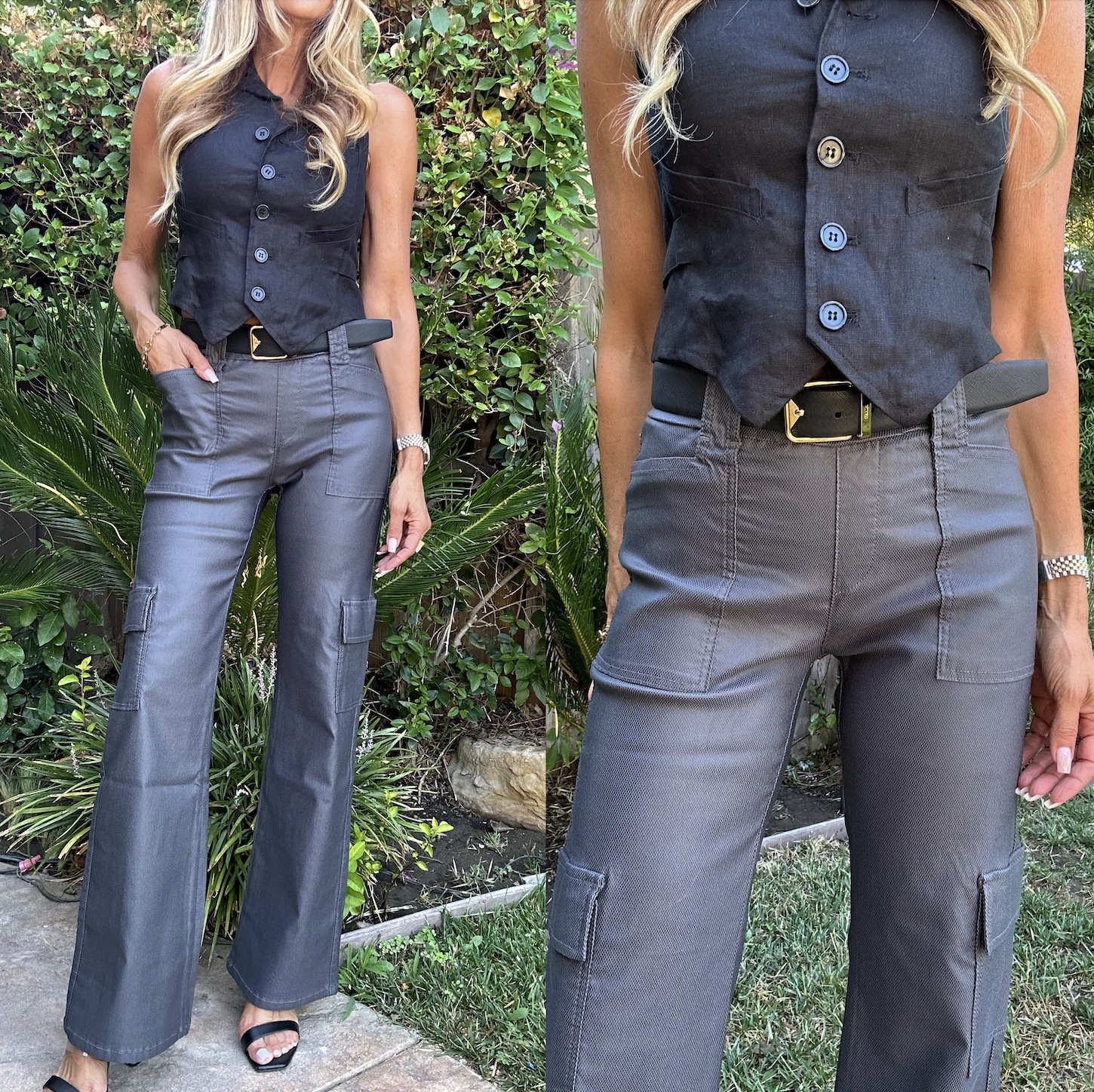 Randi Gray Domino with belt loops and flare at the ankle, soft fabric. 98% cotton 2% Lycra. Machine washable. Does not wrinkle or fade. Comfortable, stylish, very flattering. Wear them with sneakers, sandals, booties, or heels. Wear it casual or dressy for evening. Try them and you will see why these pants have been the #1 selling item in boutiques all around the U.S. Inseam: 31", Rise: 10".