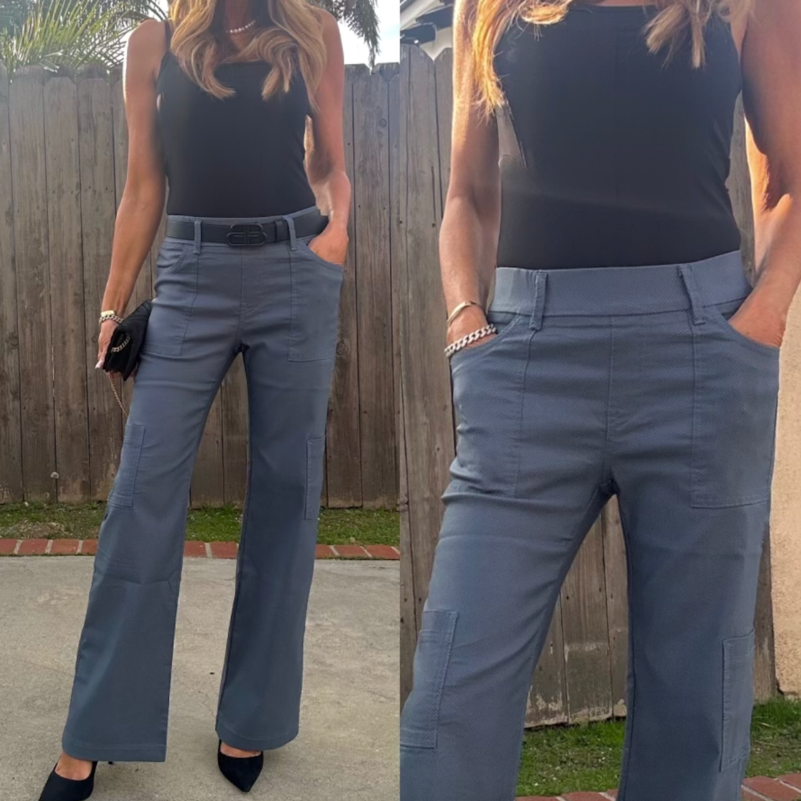 Rose Cargo Blue Specks with belt loops and flare at the ankle, soft fabric. 98% cotton 2% Lycra. Machine washable. Does not wrinkle or fade. Comfortable, stylish, very flattering. Wear them with sneakers, sandals, booties, or heels. Wear it casual or dressy for evening. Try them and you will see why these pants have been the #1 selling item in boutiques all around the U.S. Inseam: 31", Rise: 10".
