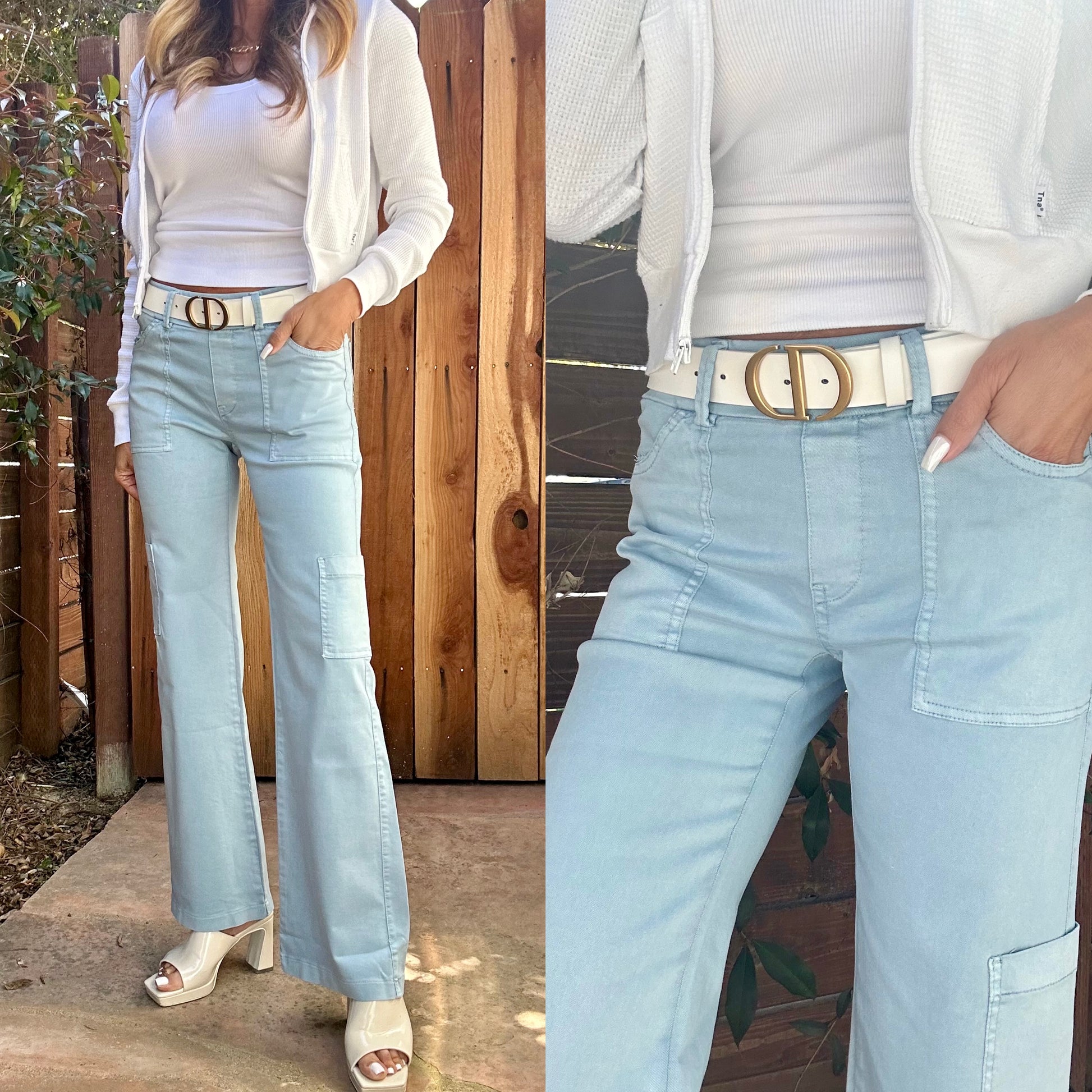 Rose Cargo Sky with belt loops and flare at the ankle, soft fabric. 98% cotton 2% Lycra. Machine washable. Does not wrinkle or fade. Comfortable, stylish, very flattering. Wear them with sneakers, sandals, booties, or heels. Wear it casual or dressy for evening. Try them and you will see why these pants have been the #1 selling item in boutiques all around the U.S. Inseam: 31", Rise: 10".