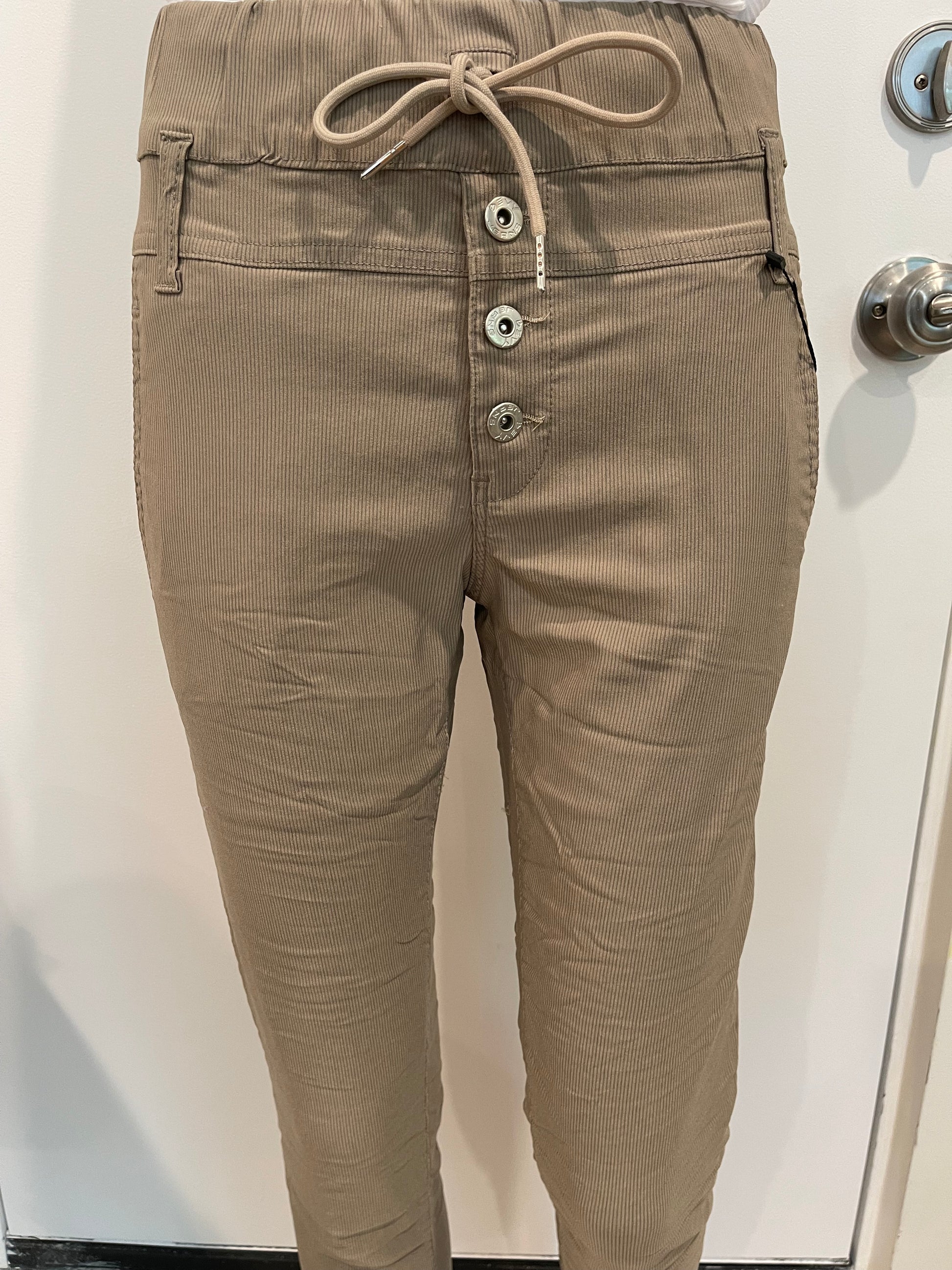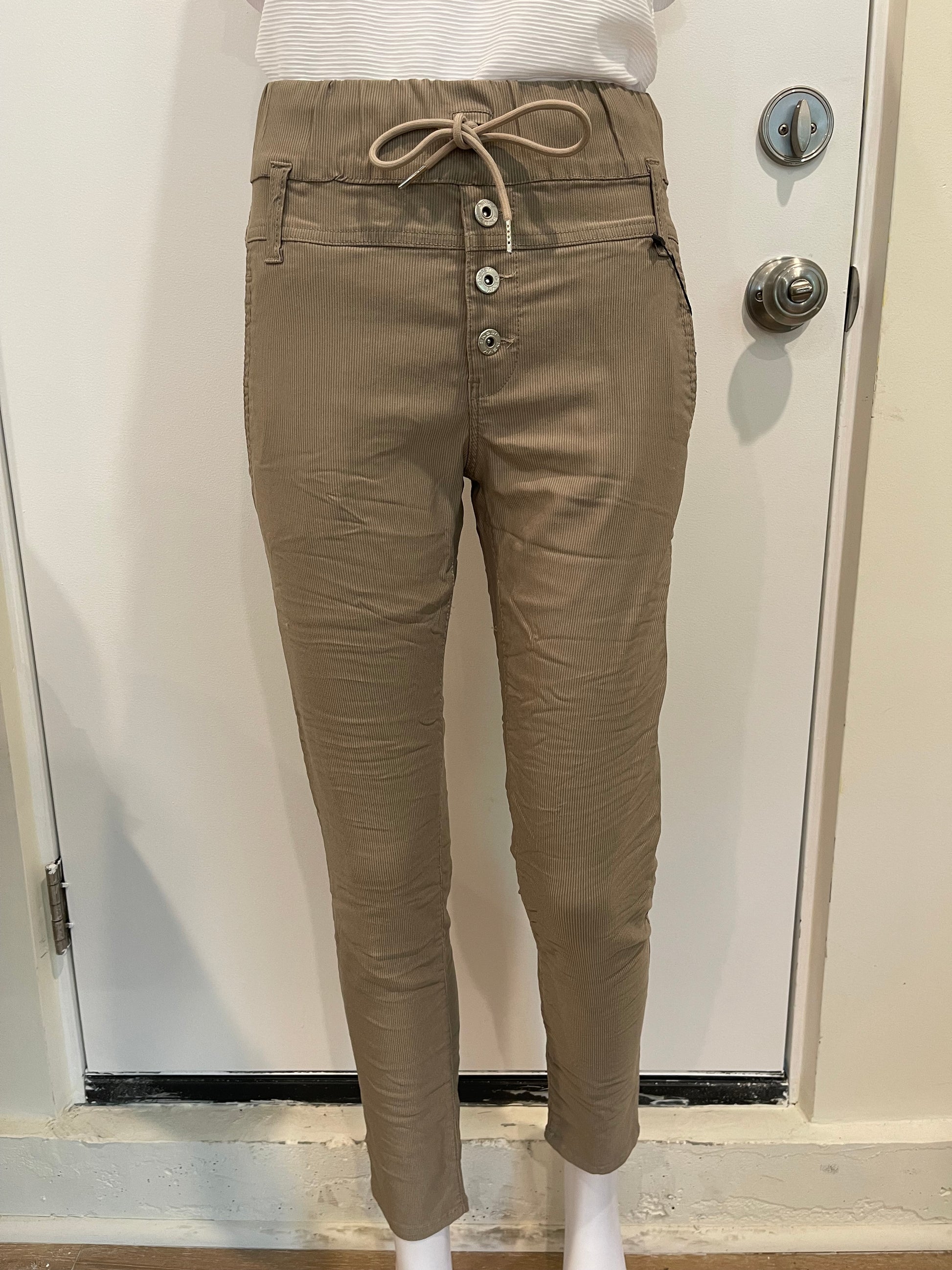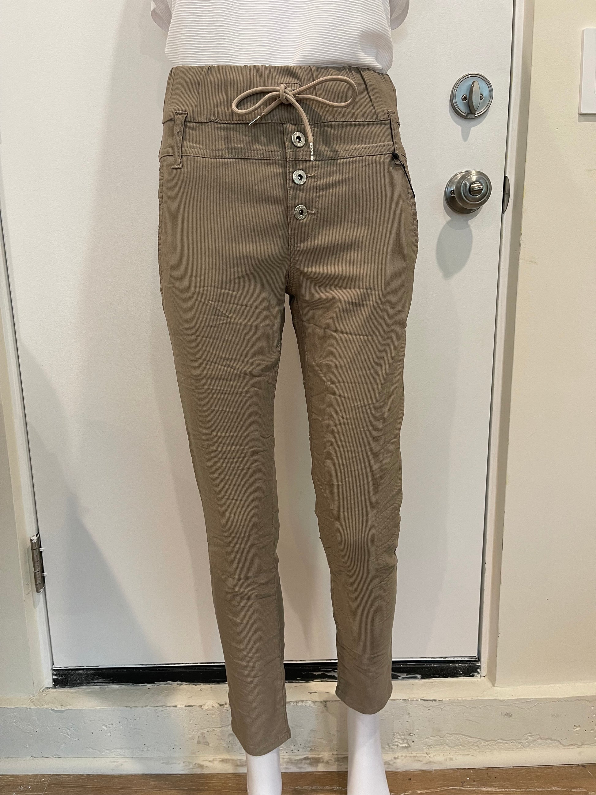 Scandal Style with a tie, belt loops & non-functional buttons. Scandal Beige Stripe. A 98% cotton 2% Lycra. Machine washable. Does not Wrinkle or Fade. Comfortable, Stylish, Very Flattering. Wear with Sneakers, Sandals, Booties, Heels. Wear it Casual or Dressy for Evening. Try them and you will see why these pants have been the #1 selling item in boutiques all around the U.S