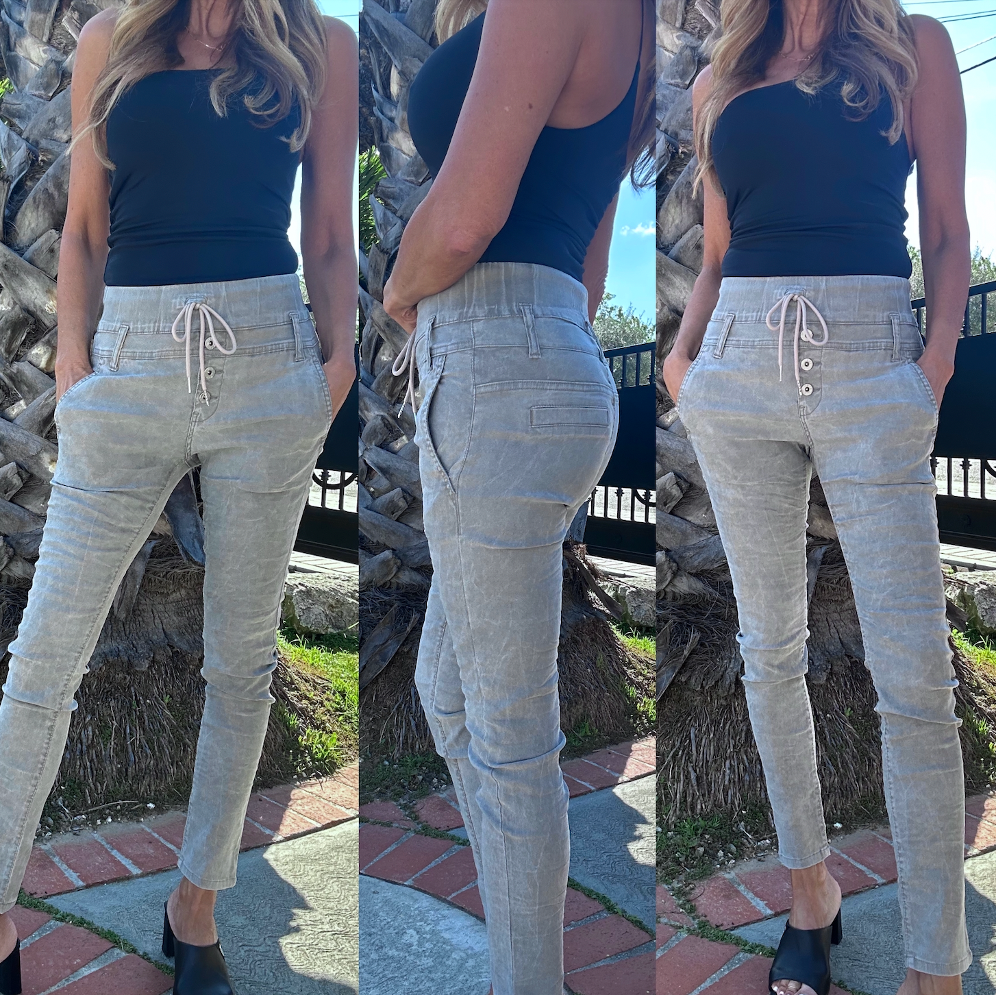 Scandal Style with a tie, belt loops & non-functional buttons . Scandal Dark Gray. A 98% cotton 2% Lycra. Machine washable. Does not Wrinkle or Fade. Comfortable, Stylish, Very Flattering. Wear with Sneakers, Sandals, Booties, Heels. Wear it Casual or Dressy for Evening. Try them and you will see why these pants have been the #1 selling item in boutiques all around the U.S