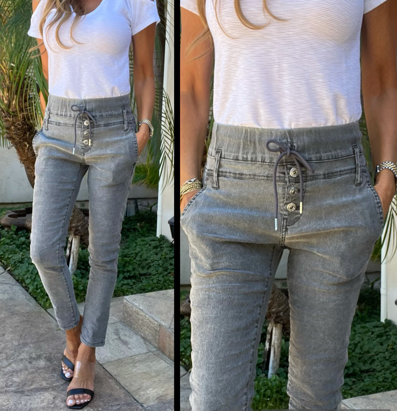 Scandal Style with a tie, belt loops & non-functional buttons . Scandal Gray. A 98% cotton 2% Lycra. Machine washable. Does not Wrinkle or Fade. Comfortable, Stylish, Very Flattering. Wear with Sneakers, Sandals, Booties, Heels. Wear it Casual or Dressy for Evening. Try them and you will see why these pants have been the #1 selling item in boutiques all around the U.S