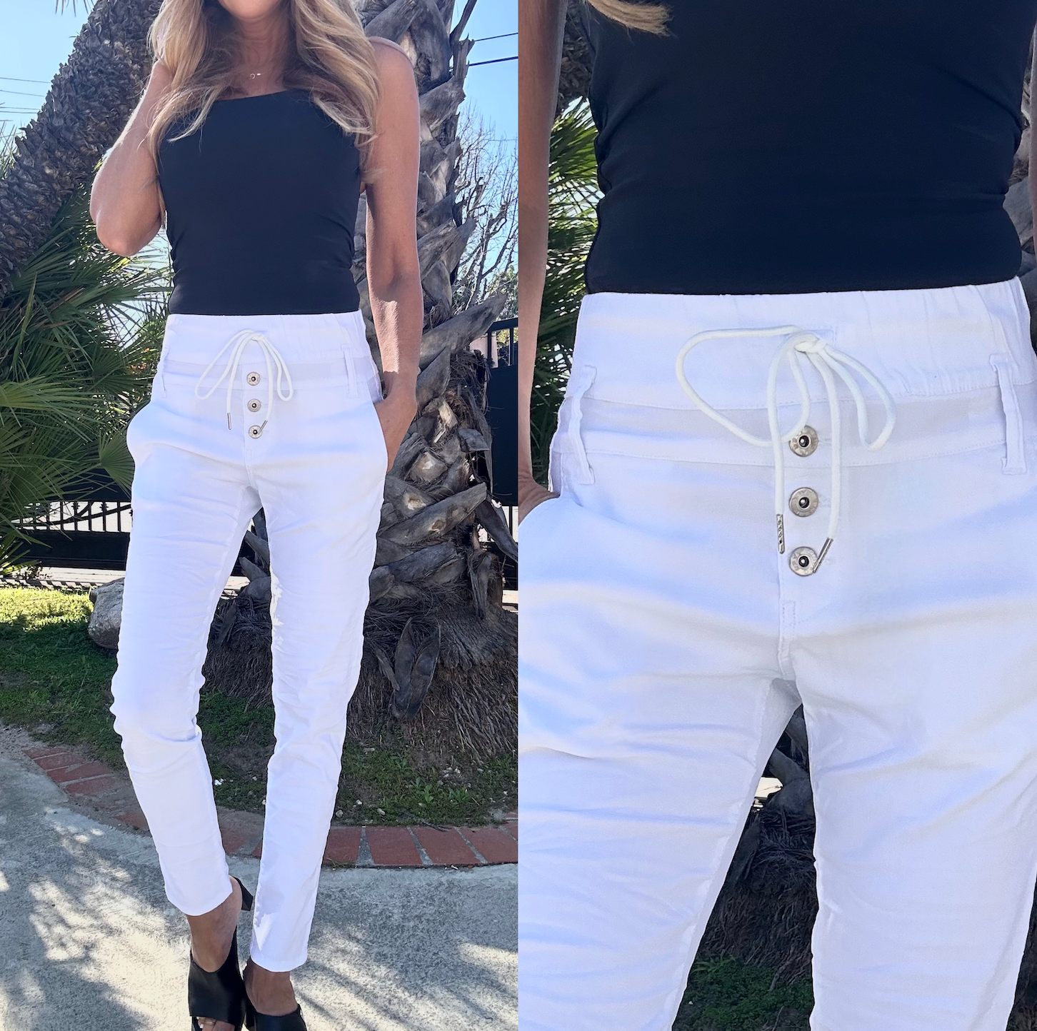 Scandal Style with a tie, belt loops & non-functional buttons . Scandal White. A 98% cotton 2% Lycra. Machine washable. Does not Wrinkle or Fade. Comfortable, Stylish, Very Flattering. Wear with Sneakers, Sandals, Booties, Heels. Wear it Casual or Dressy for Evening. Try them and you will see why these pants have been the #1 selling item in boutiques all around the U.S