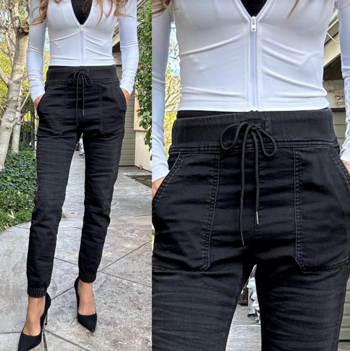 Tali Style with a Tie and ribbed cuffs at the ankle. Black Denim. 98% cotton 2% Lycra. Machine washable. Does not Wrinkle or Fade. Comfortable, Stylish, Very Flattering. Wear with Sneakers, Sandals, Booties, Heels. Wear it Casual or Dressy for Evening. Try them and you will see why these pants have been the #1 selling item in boutiques all around the U.S. Inseam: 27", Rise: 10.5".