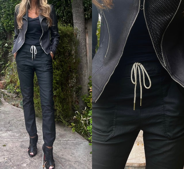 Tali Style with a Crystal Tie and ribbed cuffs at the ankle. Black Vegan. 98% cotton 2% Lycra. Machine washable. Does not Wrinkle or Fade. Comfortable, Stylish, Very Flattering. Wear with Sneakers, Sandals, Booties, Heels. Wear it Casual or Dressy for Evening. Try them and you will see why these pants have been the #1 selling item in boutiques all around the U.S. Inseam: 27", Rise: 10.5".
