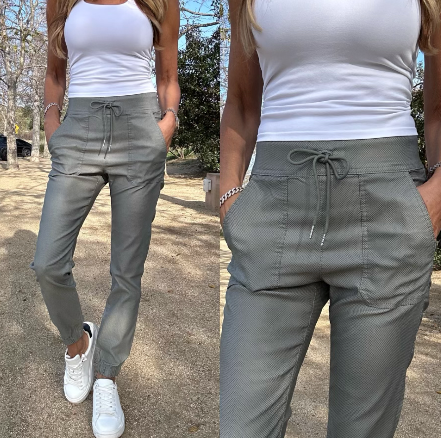 Tali Style with a Tie and ribbed cuffs at the ankle. Sage speck pattern. 98% cotton 2% Lycra. Machine washable. Does not Wrinkle or Fade. Comfortable, Stylish, Very Flattering. Wear with Sneakers, Sandals, Booties, Heels. Wear it Casual or Dressy for Evening. Try them and you will see why these pants have been the #1 selling item in boutiques all around the U.S. Inseam: 27", Rise: 10.5".
